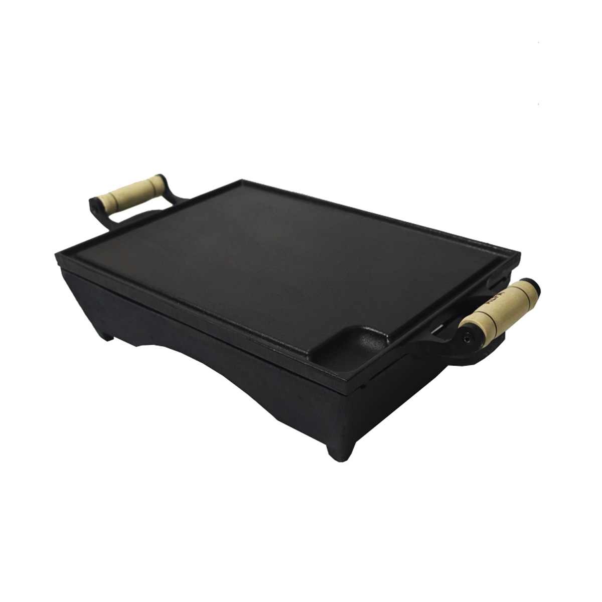 Em ferro fundido, material bastante durável e excelente na retenção e distribuição de calor, mantendo-se quente por muito tempo e garantindo um cozimento homogêneo e selagem perfeita, além de realçar o sabor dos alimentos.