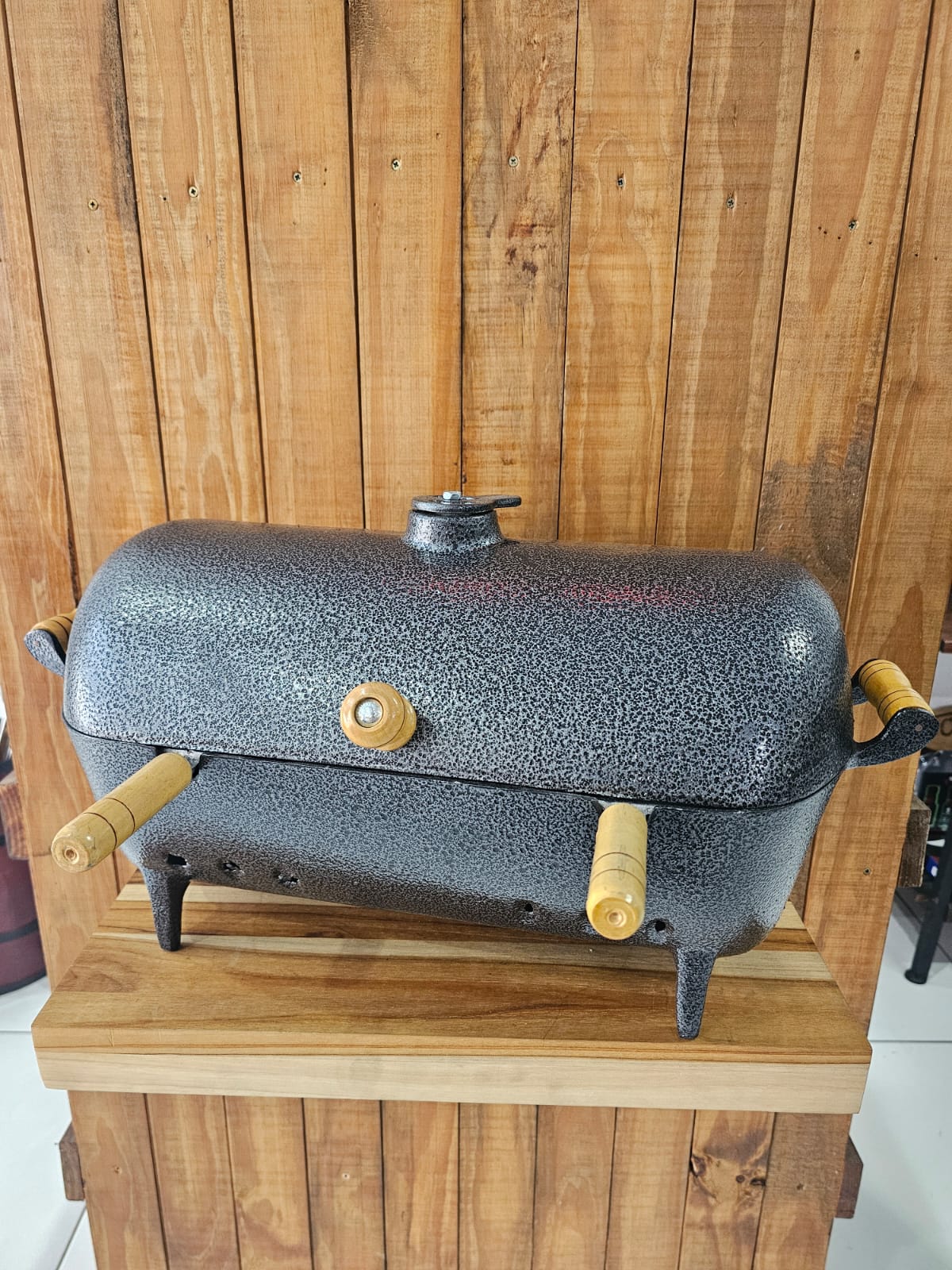 Composição: alumínio fundido revestida por pintura eletrostática e cabos de madeira.