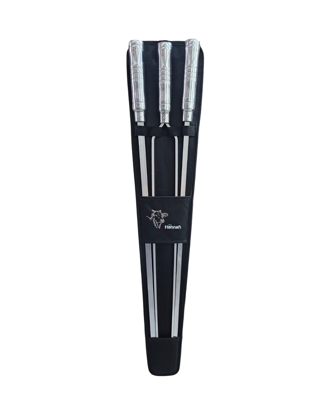 Composto por 3 espetos em alumínio, de 80 cm de lâmina, com cabos em madeira revestida de alumínio, sendo 2 no modelo espada e 1 duplo e um estojo em nylon para guardá-los. Um kit perfeito para presentear alguém.