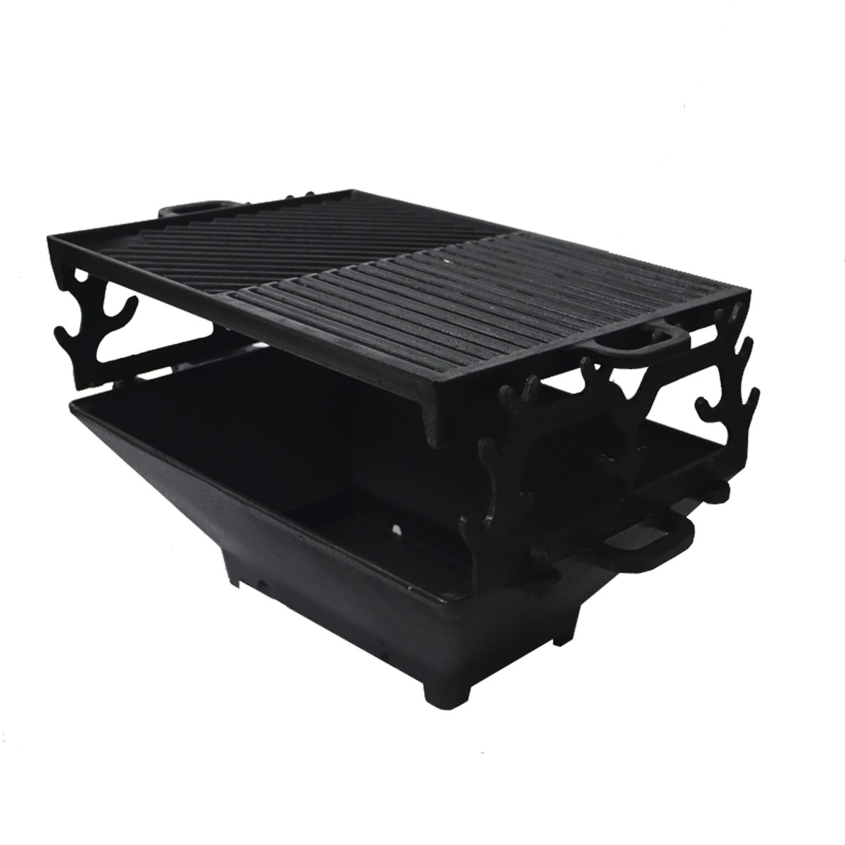 Com uma dupla grelha e chapa estriada, além de suportes para espetos, a churrasqueira retangular de ferro fundido é perfeita para um churrasco prático e delicioso em família ou entre amigos!