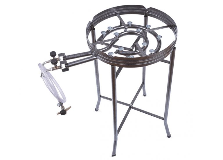 Fogareiro em aço com pintura craqueada, com 12 caulins e 75 cm de altura, para uso com discos, panelas, etc.