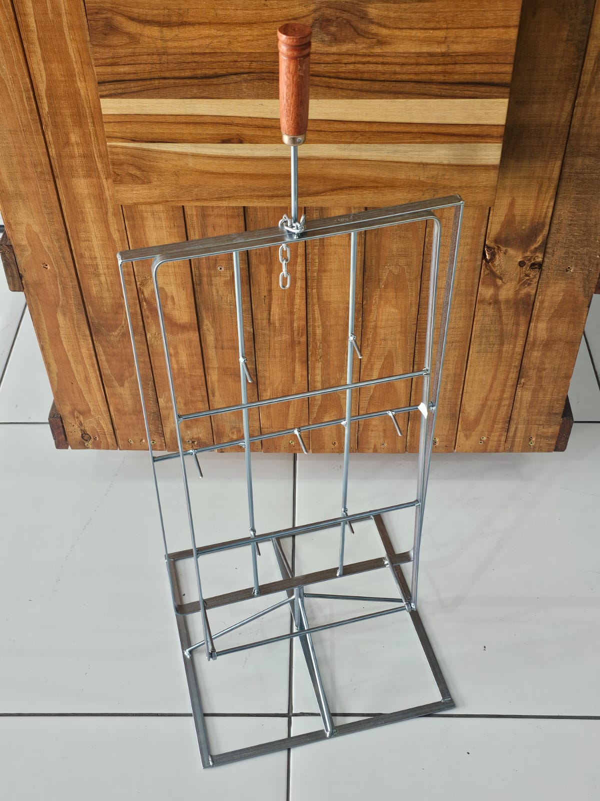 Ideal para 20 quilos, em aço galvanizado e cabo de madeira. Com base de chão giratória manual desencaixável, para facilitar a limpeza e transporte.