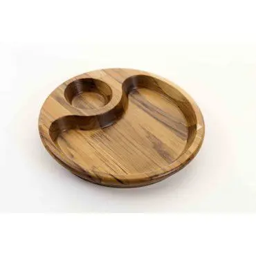 A petisqueira redonda em madeira Teca é perfeita para o momento de servir o churrasco, com uma repartição para aquela farofa ou acompanhamento de sua preferência!